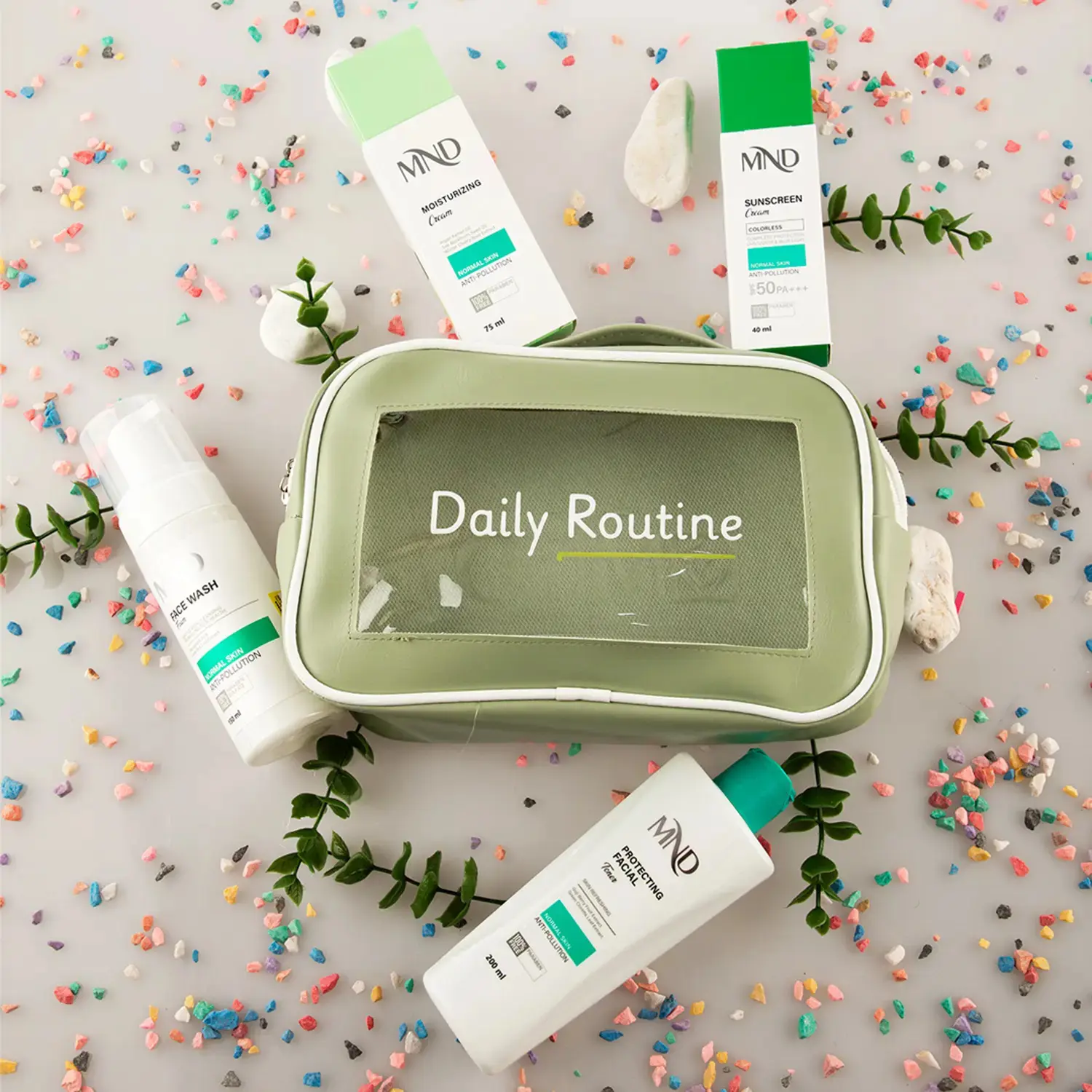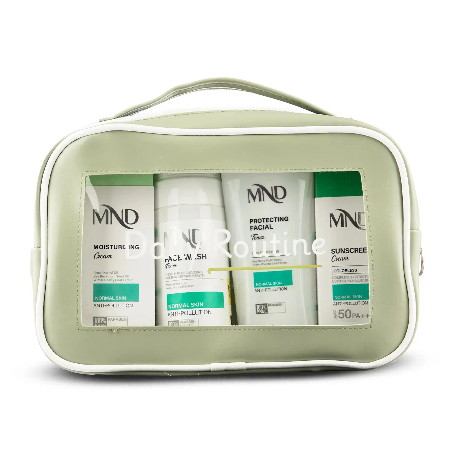 این پک مراقبت روزانه MND مناسب پوستهای معمولی بوده و شامل فوم شستشو، تونر صورت محافظت کننده، کرم مرطوب کننده و کرم ضدآفتاب است